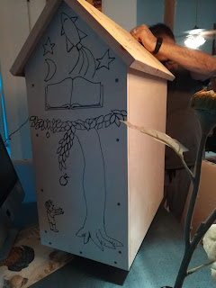 The winning Mentor/mentee Little Library theme team came by to start the painting process for our new Community Little Library. Theme: Books Keep Imagination Going.